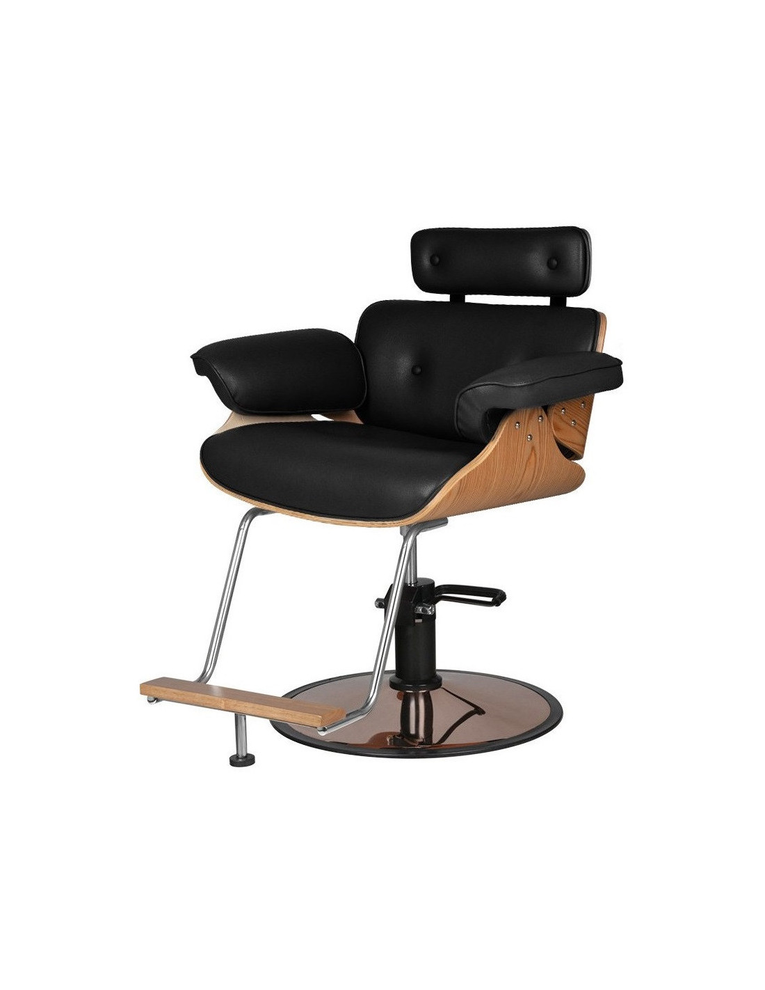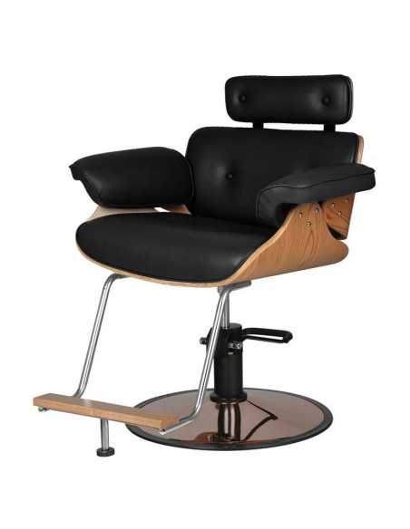 Frisörstol för klienter med hydraulisk lyft. Bekväm sits - säkerställer bekvämt sittande under långa behandlingar. Stolens överdrag är svart. Överdrag med speciellt ekoläder. Stolen är lyftbar och roterar 360 grader. Med en hydraulisk lyft höjs och sänks den, och rotationen bromsas.