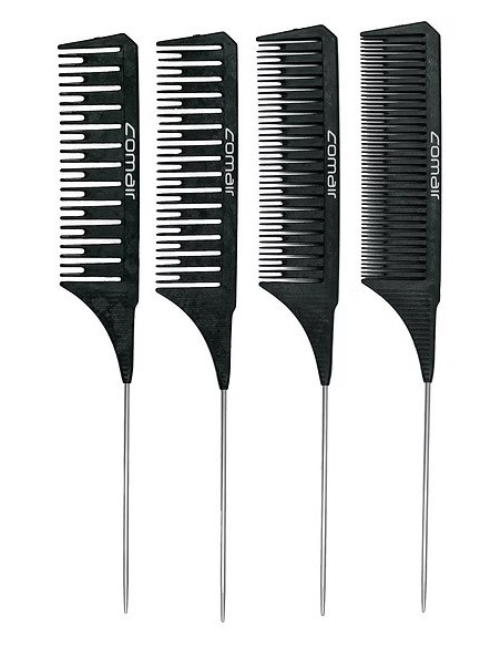 Kamset i kolfiber – 10, 15, 20, 30 tänder, 22 cm. Detta kamset är idealiskt för bleknings- och färgningstekniker. Setet innehåller 4 kammar med 4 olika tanddensiteter, vilket säkerställer exakt färgapplicering och jämn produktfördelning. Kammarna är tillverkade av ett extremt slitstarkt och hållbart material och kompletteras av en hårseparator i metall för exakt sektionering. Utformade för användning i värme upp till 150°C och är resistenta mot syror eller alkalier, vilket gör dem till ett idealiskt val för salonger med intensiv användning. Dessutom förhindrar de antistatiska egenskaperna att håret fastnar i kammen, vilket gör arbetet enklare.