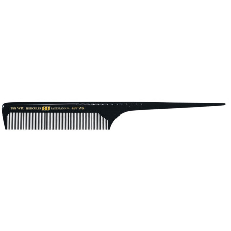 Kam nr 188WR-497WR. Med spetsiga, glesa tänder och ett långt, runt handtag för att separera hår. Hercules Sägemann teknikkamm är en ständig följeslagare för frisörer i salongen. Den är väl lämpad för att reda ut hår efter tvätt, för att jämnt fördela vårdprodukter eller för att separera hår innan det lindas på rullar. De perfekt rundade kanterna och spetsarna på tänderna, samt de polerade baserna och baksidorna på tänderna, garanterar hög komfort och maximalt hårskydd. Hercules kammar skapar inga vibrationer eller obehagligt ljud under kamning. De glider försiktigt genom håret och skapar en behaglig känsla i kundens hårbotten. Den perfekta kammen för alla tekniker: • Beprövad design med perfekt ergonomi. • Vrids inte, men är samtidigt flexibel. • Skonsam mot hårbotten och håret - tack vare perfekt rundade, ljuddämpande borst, en polerad borstbas och en anpassad kamrygg. • Glider mycket bra genom håret vid kamning. • Beständig mot kemikalier och värme.