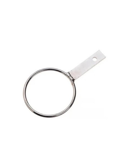Hårtorkhållare med metallring, fäst på väggen. Ringens diameter är 8,4 cm.