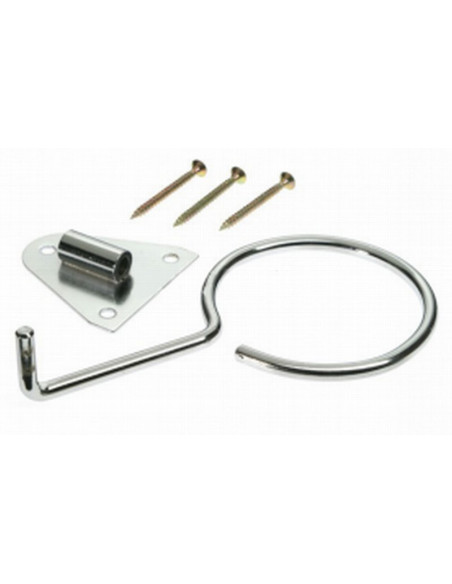 Hårtorkhållare med metallring, monterad på väggen. Ringens diameter är 7,2 cm.